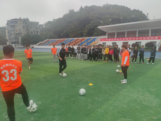 5日上午,在信息大楼报告厅,于乐为大家进行足球理论方面的专题讲座。讲座中,于老师用自身的经验与同学们互动交流。分别从教学、训练、比赛不同方面,以及老师、学生不同角度展开讲述。台下同学们认真听讲,不时做笔记。5日下午,老师和学生们集中在学校田径运动场,进行现场足球实践培训。于乐老师和滕达老师邀请了部分同学上前协助教学,从易到难讲解,配合肢体动作,先演示后实践再指导,运用比赛等独特教学方式,让同学们了解足球运动基本要领和注意事项。同学们全神贯注听讲,现场掌声不断。中途遇到下雨,师生们兴趣丝毫不减,转移到体育馆4楼继续进行培训。参加讲座的同学们纷纷表示,讲座让大家对足球理论和实践有了更加深刻的理解,开阔了视野,增长了见识,受益匪浅。