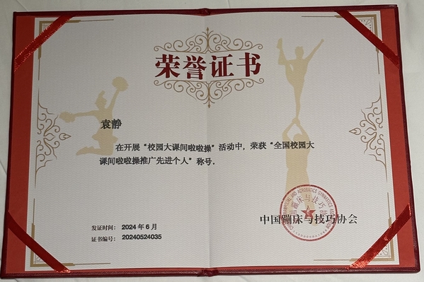 同时, 91在线 荣获“全国校园大课间啦啦操推广实施单位”称号、袁静老师荣获“全国校园大课间啦啦操推广先进个人”称号。