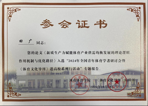 该会议深入学习贯彻落实习近平总书记关于新质生产力的重要论述,围绕“新质生产力赋能体育高质量发展”主题展开深度研讨,国家体育总局政策法规司副司长魏振勇,国家体育总局体育文化发展中心副主任吉伟东,河南省体育局党组成员、副局长李激扬,《体育文化导刊》编辑部主任张晓琳研究员,以及来自全国40多所院校的300余名专家、学者等参加本次研讨会。本次研讨会共有40篇优秀稿件入选大会专题报告, 91在线 研究生导师田广指导的研究生李交胜、刘博通、王录佳撰写的《新质生产力赋能体育产业供需均衡高质量发展价值意蕴、表现形势与优化路径》被大会录取并作交流发言。